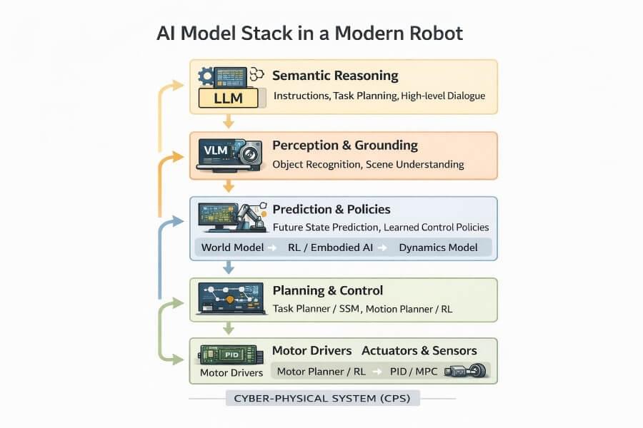 Large Language Models (LLMs), Vision-Language Models (VLMs), and Vision-Language-Action (VLA) models have dramatically expanded what robots can understand and reason about. But none of them, individually or collectively, replace the layered intelligence required for stable, safe, embodied systems. Autonomous robots, for example, rely on these integrated control systems to perceive, reason, and act autonomously in real-world environments.